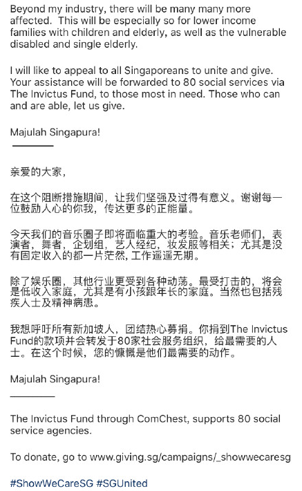 她表示疫情肆虐数月,自己身处的音乐圈,许多幕后的音乐老师、表演者、舞者、企划组、艺人经纪、妆发服饰等相关都遭受重大考验,尤其没有固定收入的人都一片茫然,工作遥遥无期;除了娱乐圈,其他行业同样受到动荡。最受打击的,将会是低收入家庭,尤其是有小孩跟年长的家庭,当然也包括残疾人士及精神病患,“我想呼吁所有新加坡人,团结热心募捐给需要的人事,在这个时候,您的慷慨是他们最需要的动作”。