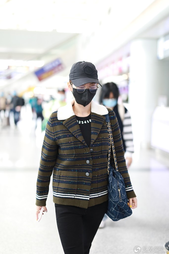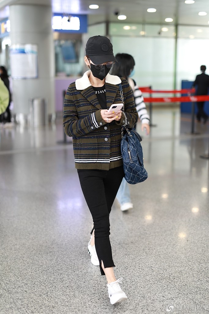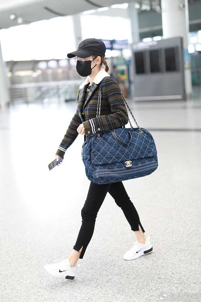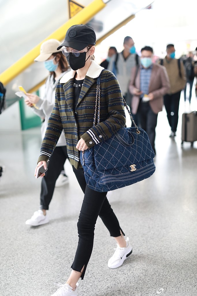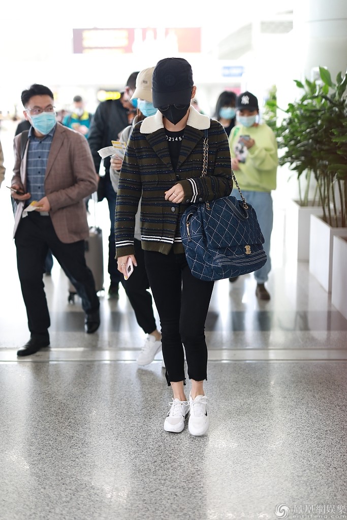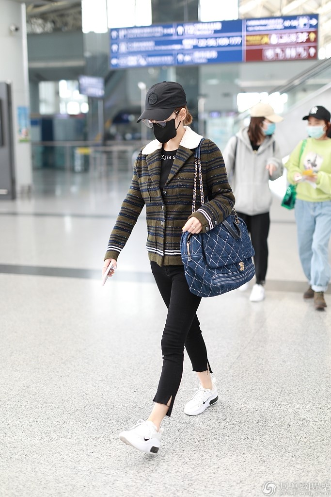 张嘉倪戴好口罩帽子,穿格子上衣,背了一个大包更显身材纤细。