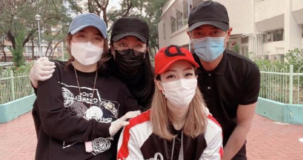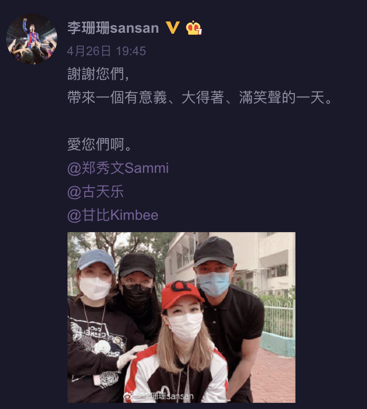 4月26日,1996年香港姐选举的冠军李珊珊在社交平台上与郑秀文、古天乐、甘比分享了一张照片,前往社区做志愿者工作。他还感谢了他们三个。