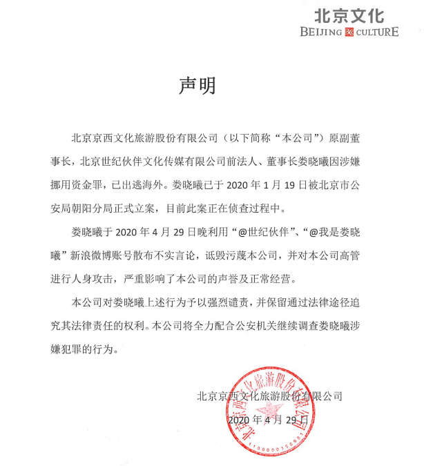 4月29日晚,北京文化针对微博用户“我是娄小西,自称是北京文化原副董事长”转发北京文化董事长宋歌“挪用资金、侵占职位、弄虚作假”微博实名举报一事发表声明。北京世纪合伙制文化传媒有限公司前法人、董事长娄小溪因涉嫌挪用资金逃往海外。娄小溪于2020年1月19日被北京市公安局朝阳分局正式立案,案件正在调查