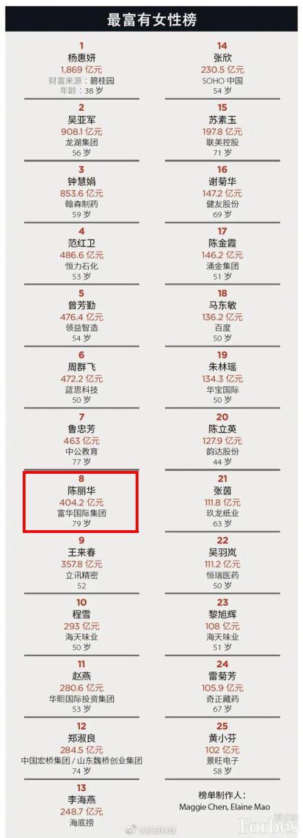近日,福布斯中国发布了2020最富有女性榜。来自碧桂园的杨惠妍连续三年荣登中国最富有女性榜榜首,排名第二和第三的分别是来自龙湖集团的吴亚军和来自翰森制药的“医药界黑马”钟慧娟。长春国贸注意到,《西游记》中唐僧扮演者迟重瑞的妻子、79岁的陈丽华以404.2亿元位居第八
