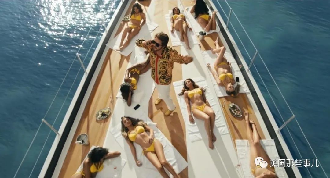 和一大群模特寻欢作乐,在游艇上喝香槟晒太阳,还不忘骂端香槟的服务生: