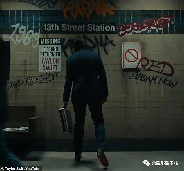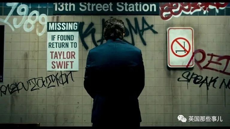 拉近看,还会发现墙上贴着一张“失踪:如果找到请还给泰勒·斯威夫特”的小广告,以及“禁止滑板车”(Scooter也有滑板车的意思)的标志。↓