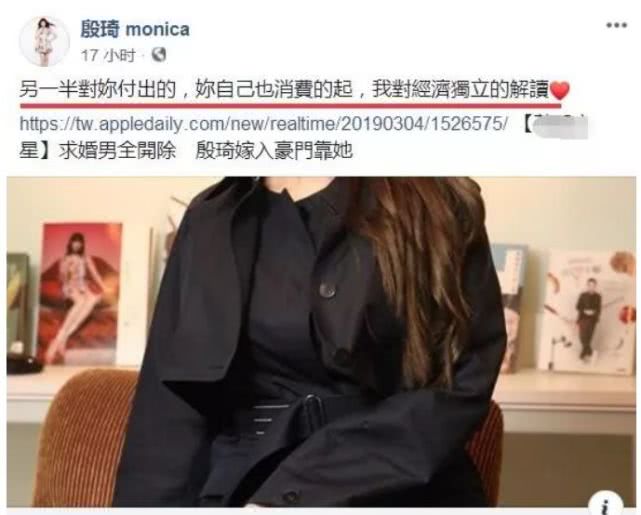 婚后,殷琦接受媒体专访聊起两人的生活,针对外界种种猜测,比如她看上老公张仕育的钱才同意结婚的等等传闻,殷琦表示:夫妻俩财务独立,老公只给她和妈妈一张无上限的附卡,她也看不惯会伸手要钱的女生。
