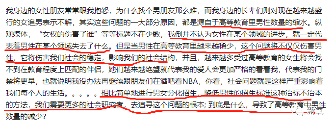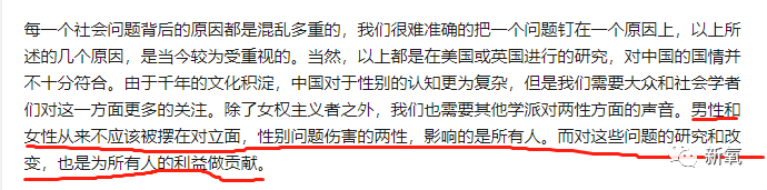 在这篇文章里他客观阐述现代社会接受过高等教育女性比例多于男性,但难能可贵的是他并没有一味吹捧女性,或为自己的性别喊冤,而是客观地去分析问题本身,并表达“男性和女性从来不应该被摆在对立面,性别问题伤害的是两性,影响的是所有人”。