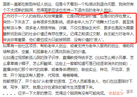 除此之外,谈到退休问题,除了福利等常见角度,他提到了“老年人人生价值、社会价值”的问题。