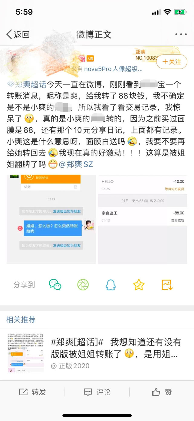 该网友表示,自己早前在郑爽的二手平台购买了88元的面膜,和一个10元的商品。如今突然收到郑爽的退款,一时摸不着头脑,直问:“我要不要给她转回去?”难道爽妹子又发起了粉丝福利,白送面膜了?不过最让这名粉丝高兴的是,她竟然被偶像翻牌了。