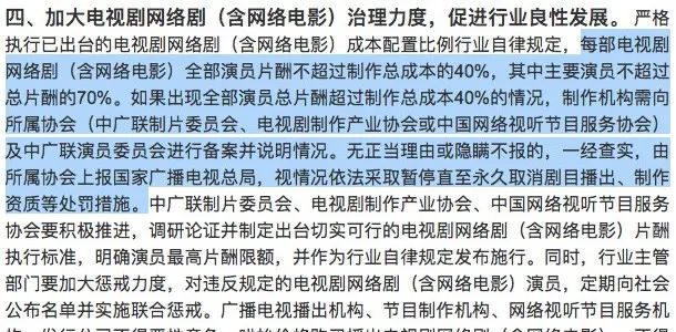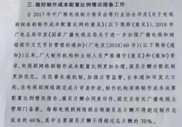 在新规第三项制作成本报备工作中,全部演员片酬不超过总成本40%,主演片酬不得超过70%,受到创作端支持。需要注意的是,这并非完全是新规。在2018年广电总局印发的《国家广播电视总局关于进一步加强广播电视和网络视听文艺节目管理的通知》,就已经有对于片酬的强调和规划。