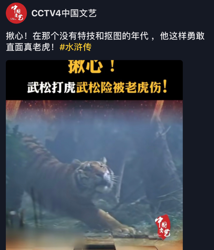 27日,cctv4文艺频道曝光1998年的《水浒传》里“武松”丁海峰打的是真老虎。配文写道:“揪心!在那个没有特技和抠图的年代,他这样勇敢直面真老虎