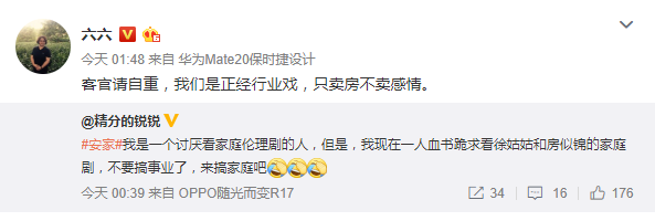 2月27日,就有网友发文表示比起剧中“搞事业”的情节,更想看孙俪和罗晋饰演的男女主角之间的感情戏份,“我是一个讨厌看家庭伦理剧的人,但是,我现在一人血书跪求看徐姑姑和房似锦的家庭剧,不要搞事业了,来搞家庭吧”。