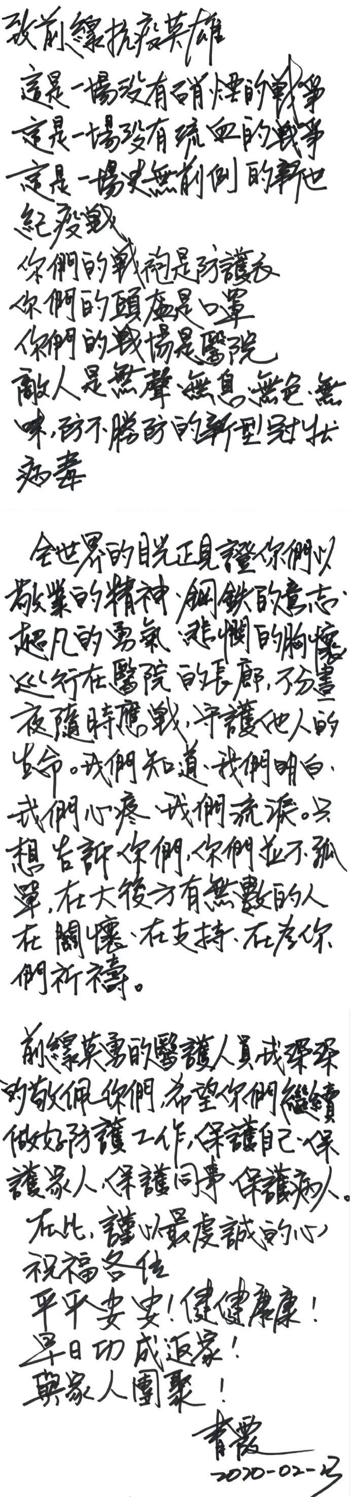 2月26日,林青霞手写信曝光,致敬前线的医护人员,她称抗击疫情是一场无声、无硝烟、史无前例的战争,我们也在身后给予关注和支持。同时,她希望各位能够做好防护工作,保护好自己,早日功成返家,与家人团聚。