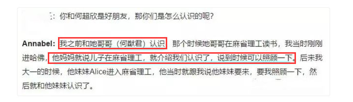 姚安娜曾在受访时提到,自己跟何超欣认识是因为何猷君的关系,当时何猷君还在麻省理工读书,而她则刚入读哈佛大学,于是赌王四太就和她说自己儿子在麻省,可以相互认识照顾一下。之后姚安娜进了哈佛,何超欣又去了麻省,何猷君便将自己妹妹托付给姚安娜照顾。