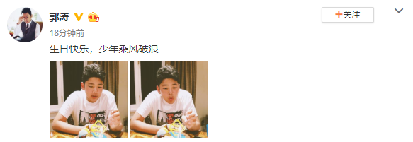 2月26日是郭涛儿子郭子睿(石头)13岁的生日,下午郭涛晒出为他庆生的照片,祝福道:“生日快乐,少年乘风破浪。”照片中石头身穿白色T恤,一头自来卷黑发,五官俊朗帅气,正吹着蛋糕上的蜡烛。更为显眼的是,生日蛋糕上还写着“男神石头,生日快乐”。