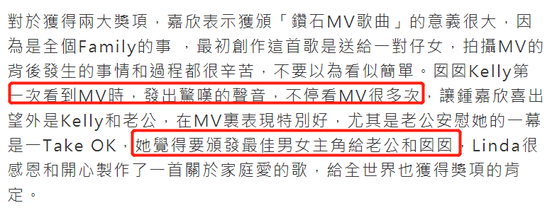 对于此次获奖,钟嘉欣非常兴奋,对于她来说更是意义重大,因为这次大奖的功劳不仅仅是自己和团队,还要特别感谢她的老公和女儿的支持。