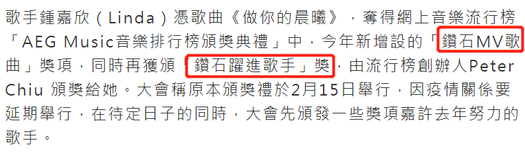 这次钟嘉欣凭借歌曲《做你的晨曦》,获得“钻石MV歌曲”和“钻石跃进歌手”两座大奖,也算是大家对她复出以来的认可,颁奖典礼也会在接下来的日子里进行,先恭喜钟嘉欣了。