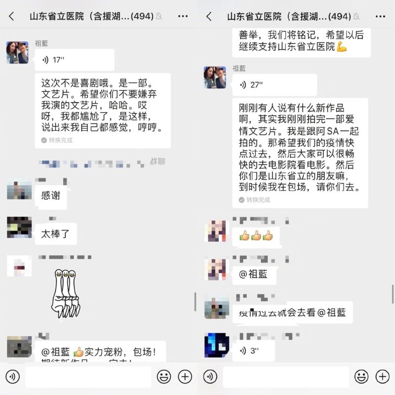 据悉,王祖蓝空降北京大学人民医院援助武汉医疗队、山东省立医院和援助武汉医疗队、湖南省儿童医院援鄂医疗队、重庆赴孝感对口支援队聊天群,为众多医护人员送祝福、送福利、加油、唱歌,一起向抗击疫情的医护人员致敬。