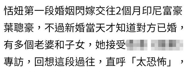 在经历了两年噩梦般的生活后,恬妞决定离婚,当她回想起这段往事都直呼:“太恐怖,一生的罪已经在印尼受完了”