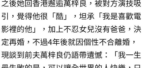但好景不长,结婚四年后,两人就被曝出离婚传闻,恬妞曾说过:“我一生最失败的是,可以让全世界的人快乐,只有一个人做不到,就是万梓良”。