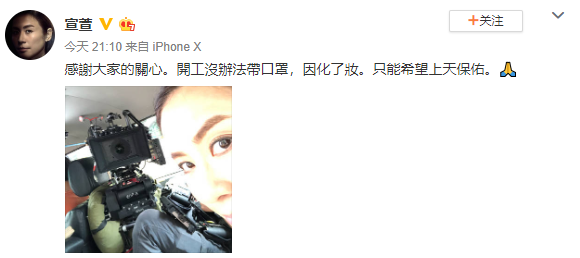 2月25日晚,宣萱晒自拍照,并写道:“感谢大家的关心。开工没办法带口罩,因化了妆。只能希望上天保佑。”照片中,宣萱化着精致的妆容,漂亮的大眼,前方架着摄影机,看来是开工了。网友留言称:“女神照顾好自己,勤用消毒液。”“期待新剧!”“注意防护!”