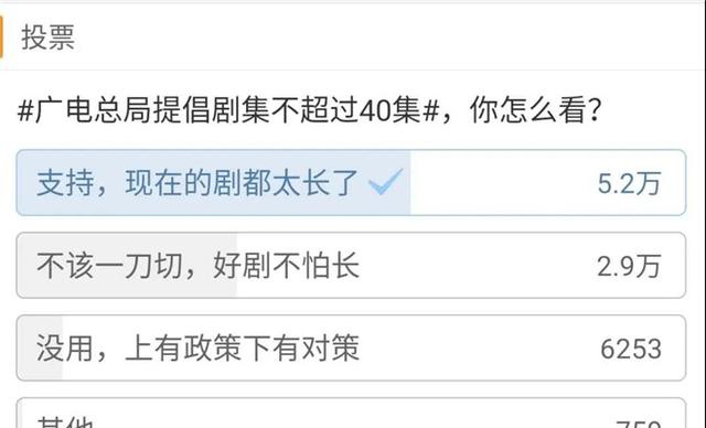 在新浪电视官微创建的投票中,支持这一倡议的网友达到5.2万,占比总投票人数58.2%。当前,广电总局提倡剧集不超过40集的热门微博话题阅读量近8000万。