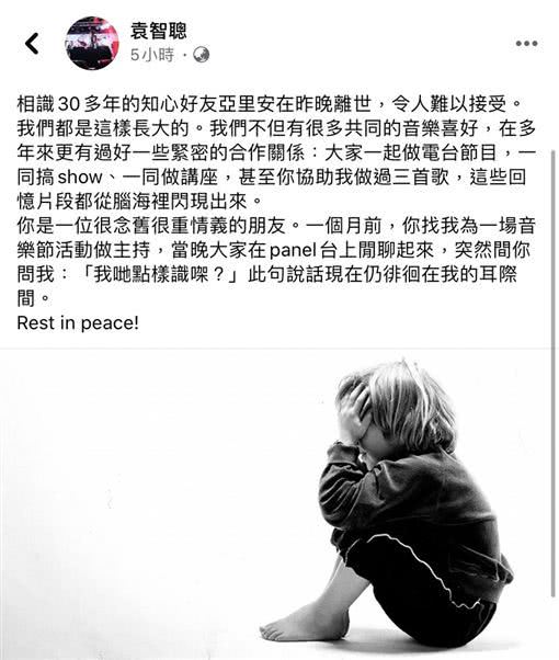 2月25日,袁智聪在社交账号上发文悼念:“相识多年的知心好友亚里安在昨晚离世,令人难以接受。我们都是这样长大的。我们不但有共同的音乐喜好,在多年来更有过一些紧密合作。大家一起做电台节目。一同做讲座,一起搞show,甚至你还协助过我做过三首歌,这些回忆片段都从脑海里闪现出来。”