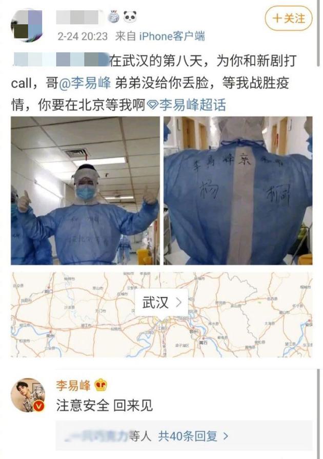 2月25日,李易峰回复了自己一位身在武汉的医护粉丝,该粉丝晒出了自己身穿防护服的工作照,隔空喊话李易峰“你要在北京等我啊”。随后,李易峰暖心鼓励道:“注意安全,回来见”。