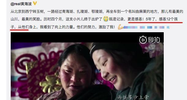 黄海波连续五年援助了12个失学的贫困孩子,去年,黄海波踏上了去看望他们的旅途。黄海波用四个月拍了一个短片,他称“既是记录,也是感恩。从他们身上,看到了向上的力量,他们的努力,激励了我。”
