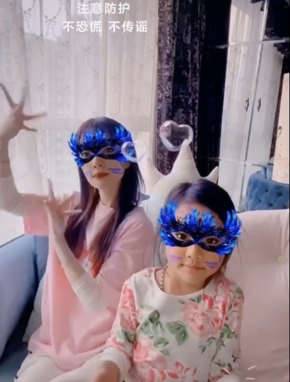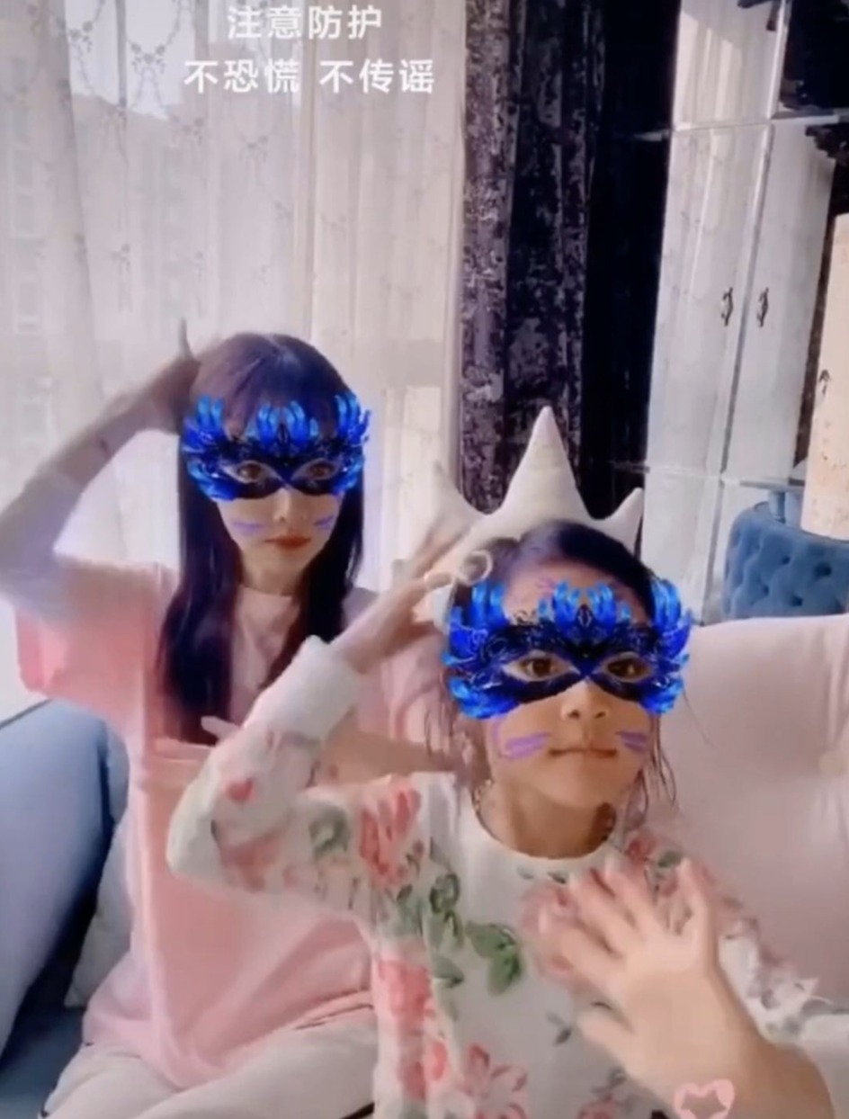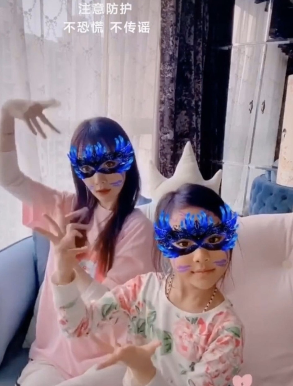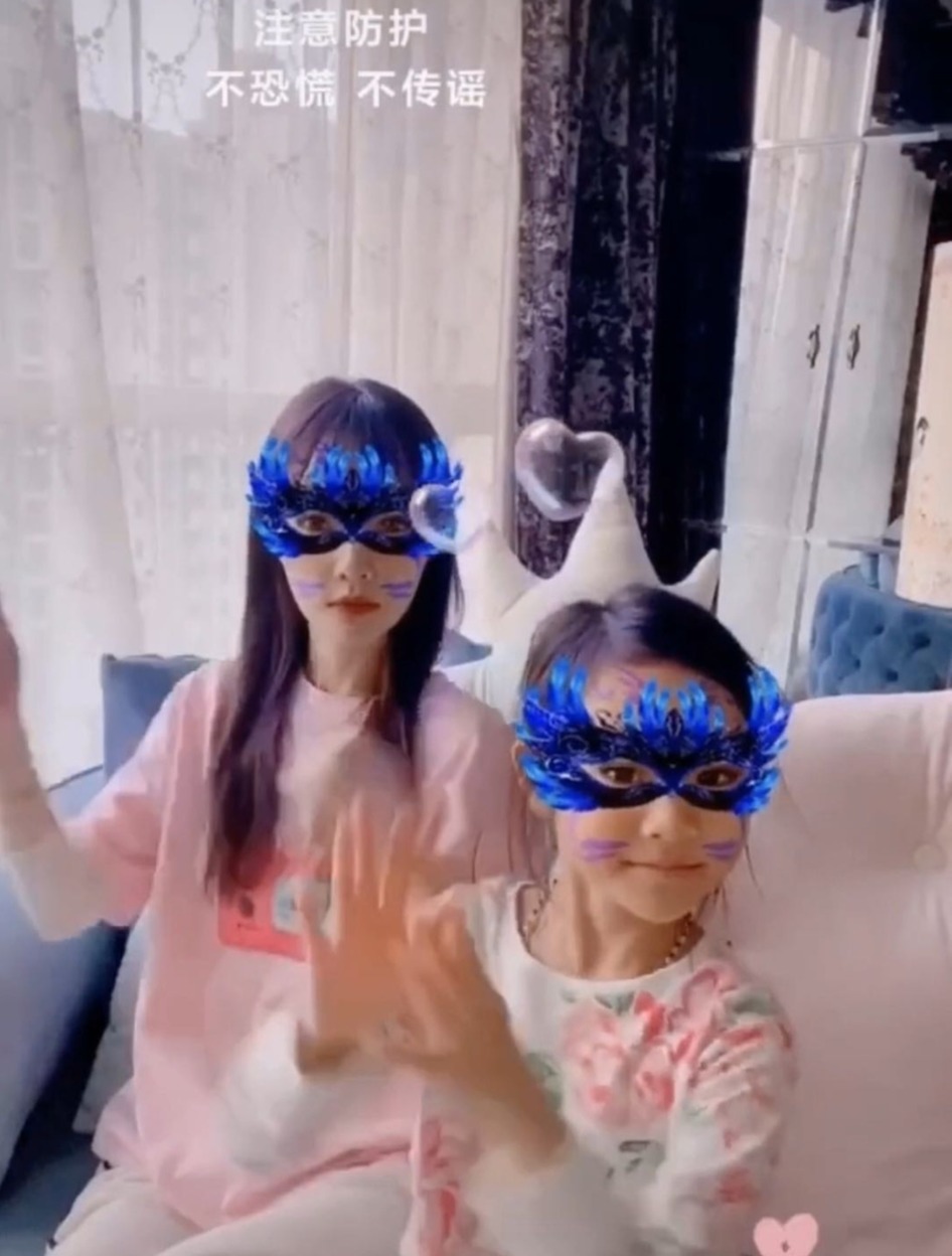 李小璐宅家不无聊和甜馨蒙面玩手指舞。