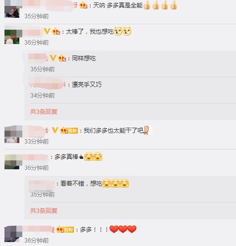 看到孙莉晒出的照片,网友纷纷留言:“天呐 多多真是全能”、“漂亮又手巧”、“我们多多也太能干了吧”。