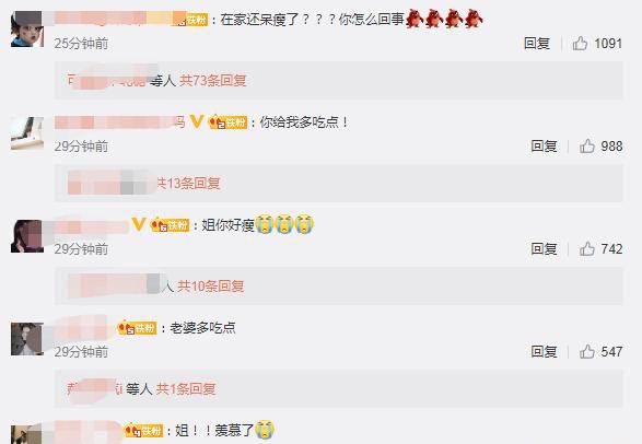 看到大幂幂的动态后,网友纷纷留言:“在家还呆瘦了???你怎么回事”、“你给我多吃点!”、“姐你好瘦”。