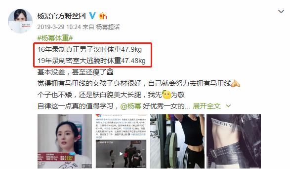 早年大幂幂参加真人秀《真正男子汉》时也曾自曝过体重,当年的她还比现在重一点。而根据杨幂官方粉丝团透露,去年录制综艺节目《密室大逃脱》时,大幂幂都还保持着47.48kg的体重,而16年和19年录制节目时的体重浮动都不大。没想到如今宅在家里她竟然还比之前瘦了两公斤多,简直羡慕嫉妒了有木有!