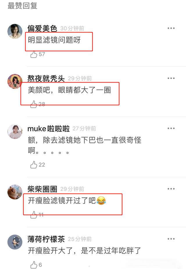 网友都纷纷留言表示这是“网红滤镜”摧残了女神的颜值:“明显滤镜问题呀!”“美颜吧,眼睛都大了一圈。”“开瘦脸滤镜开过了吧!”
