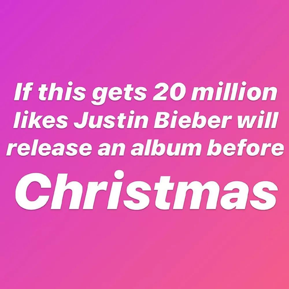 11月份他在社交平台发布一张图片,写着:“圣诞节前得到2000万个赞,那就发布新专辑”!