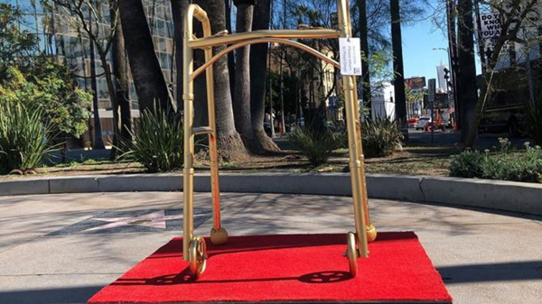 除了法庭交锋之外,在澎湃新闻此前的相关报道中提到过的韦恩斯坦的助步神器,也在上周再度成为了焦点。一边厢,人称洛杉矶班克西的街头艺术家塑料耶稣(Plastic Jesus)在好莱坞星光大道上放置了一件装置艺术作品——涂成金色的韦恩斯坦同款助步器,上面的吊牌还标注着“请交还给道具部门”的字样。他将这件艺术品命名为“最佳配角”(Best Supporting Role)。此处的“配角”一词,还有着“助步”的含义,可谓一语双关,显出这位英国出生的匿名艺术家对于哈维·韦恩斯坦的不屑与讽刺。