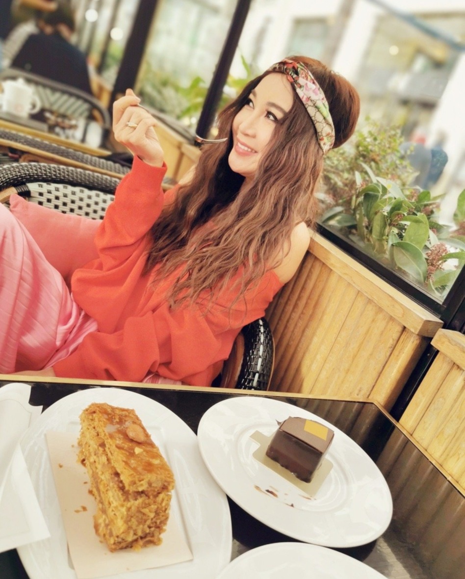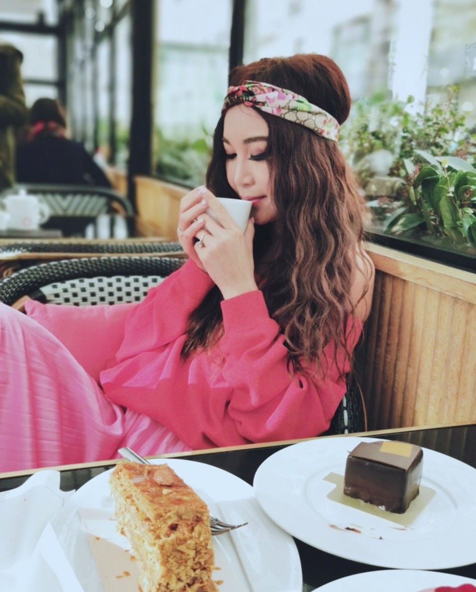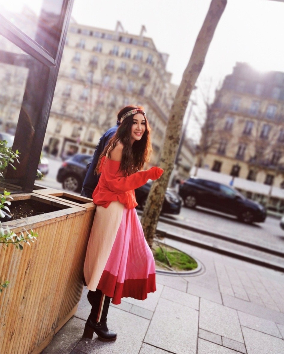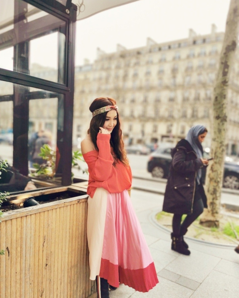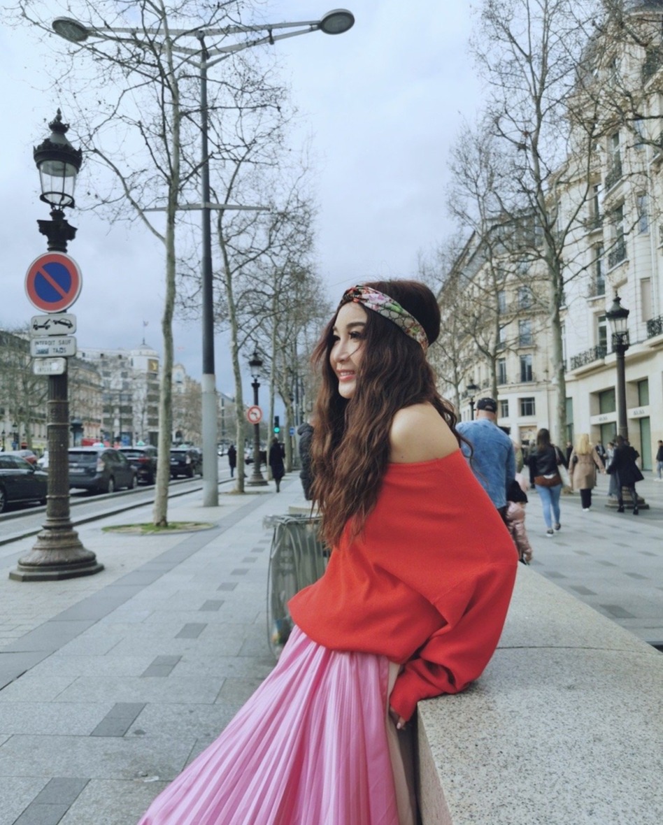 照片中,她头戴发带波浪卷长发披肩,身穿红色露肩毛衣搭配粉色长裙,一身装扮下来少女感满满,在街头拍照大秀香肩十分性感。