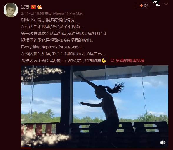 另外,吴尊拍下女儿练功夫的过程来给大家加油打气,“跟NeiNei说了很多疫情的情况...在她的武术课前,我们录了个视频...”并表示希望大家坚强,乐观,做自己的英雄。