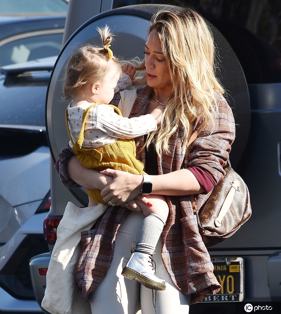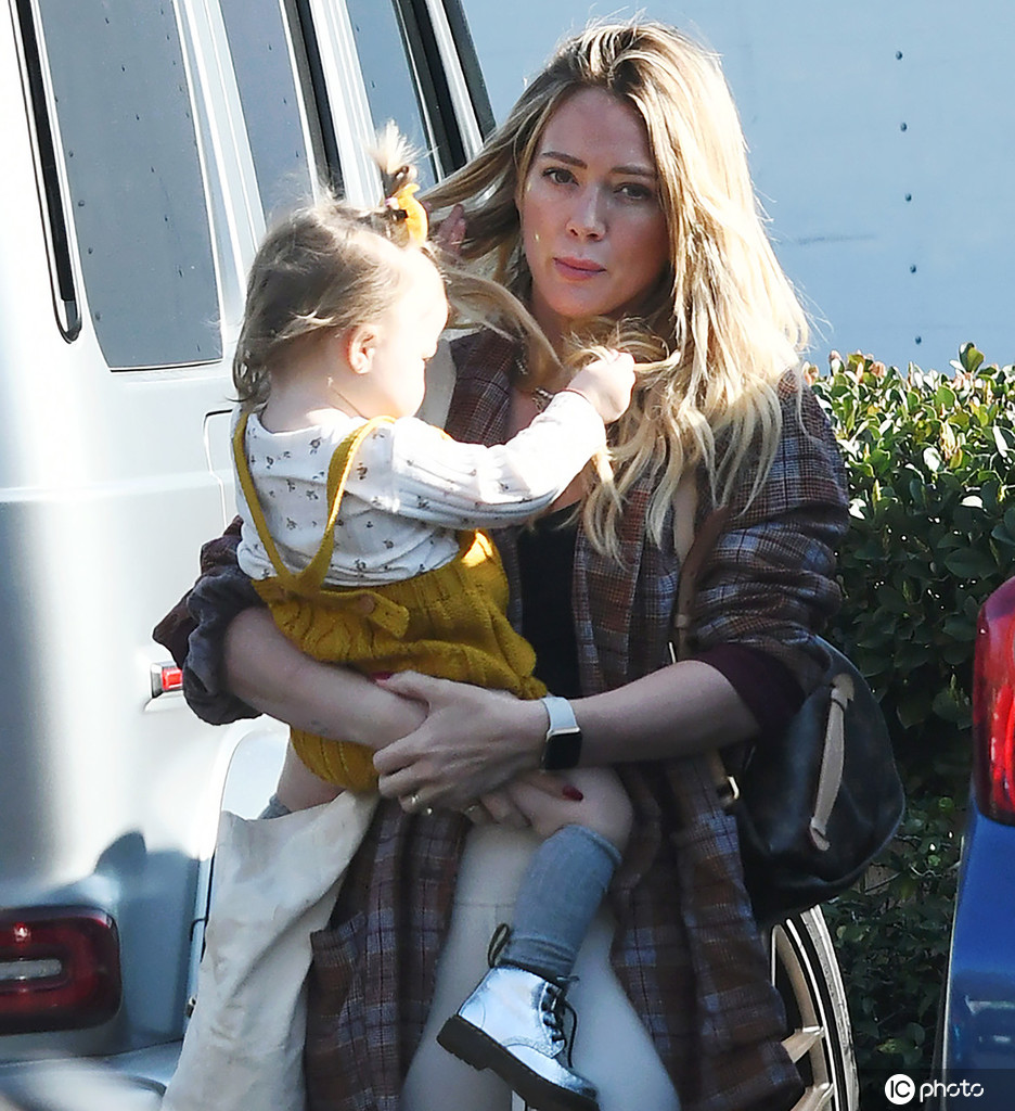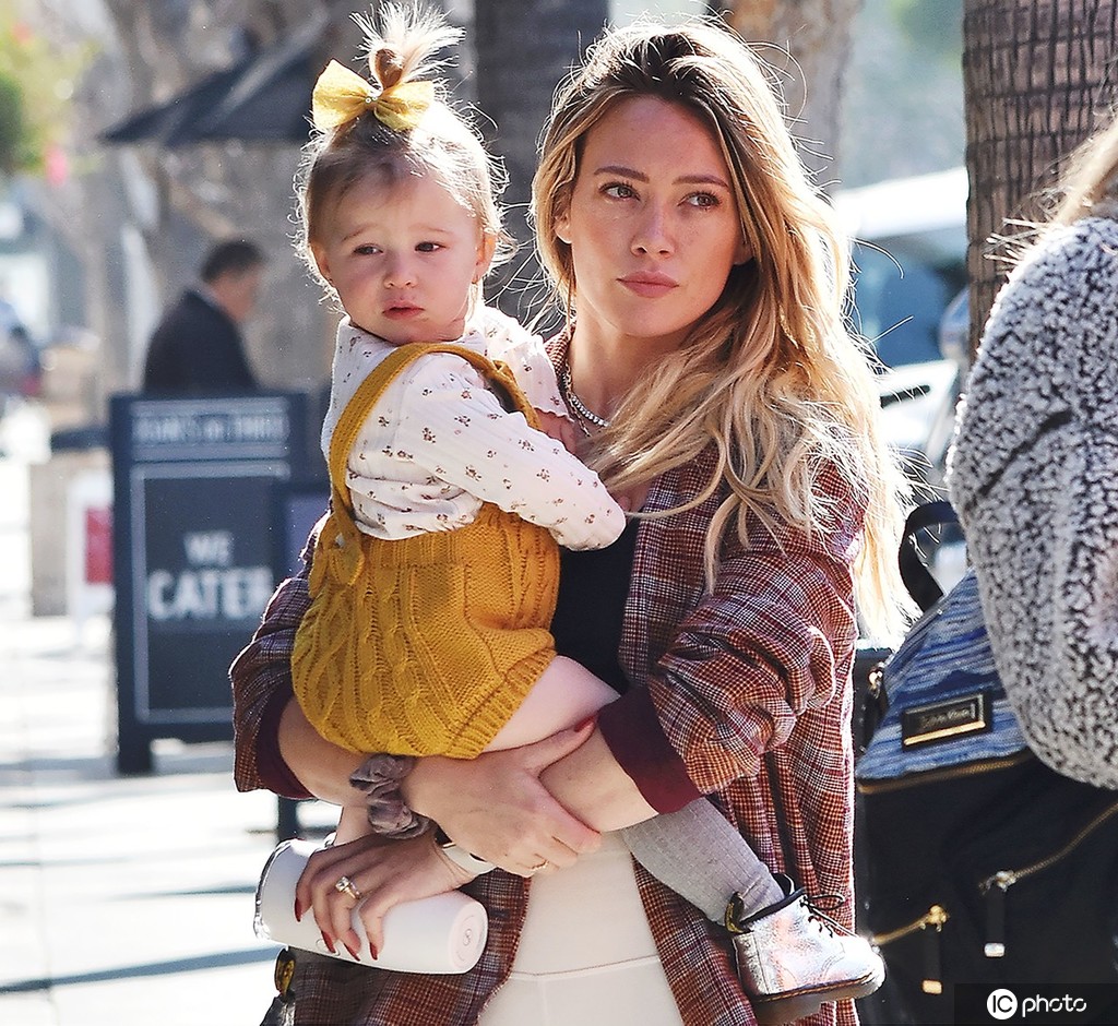 当地时间2020年2月14日,美国洛杉矶,希拉里·达夫抱女儿现身街