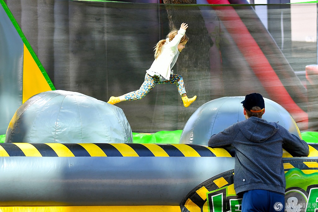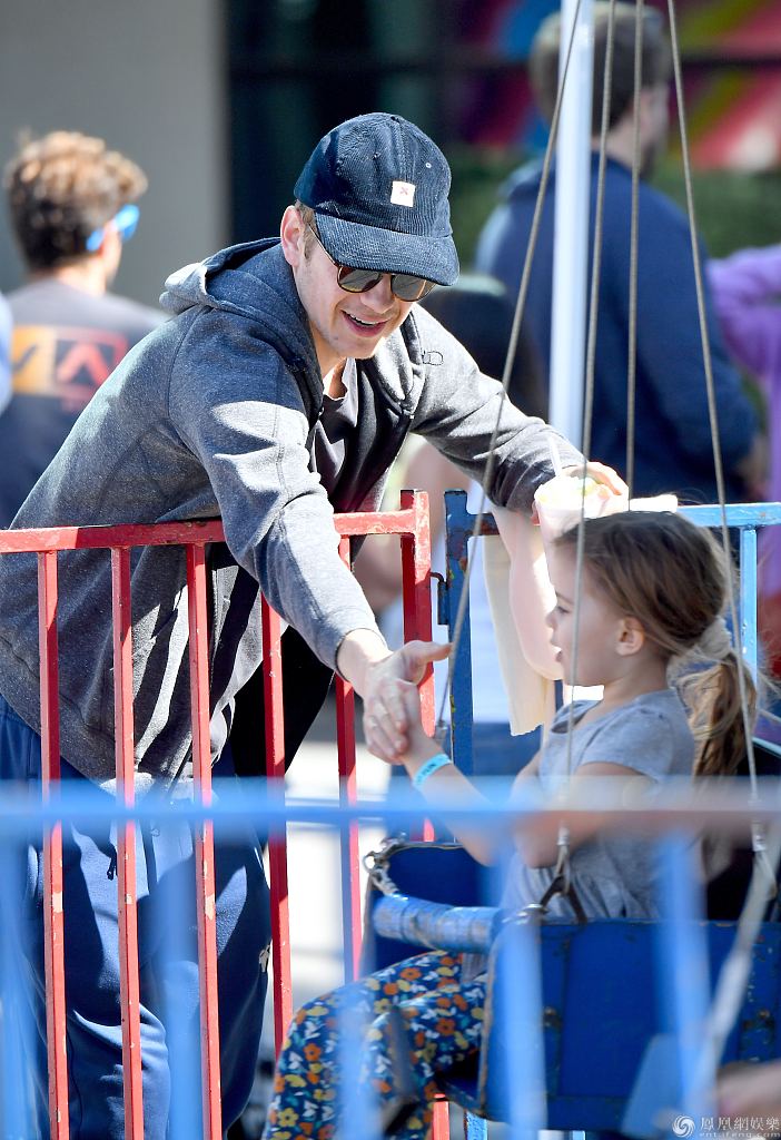 他身穿灰色卫衣和蓝色裤子十分休闲,抱着萌娃在游乐场玩游戏十分开心。