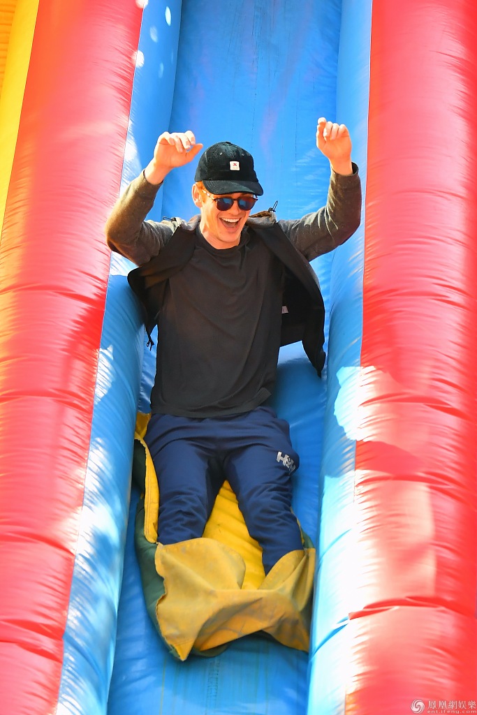 期间,海登自己也不忘体验滑梯,振臂高呼童心未泯。