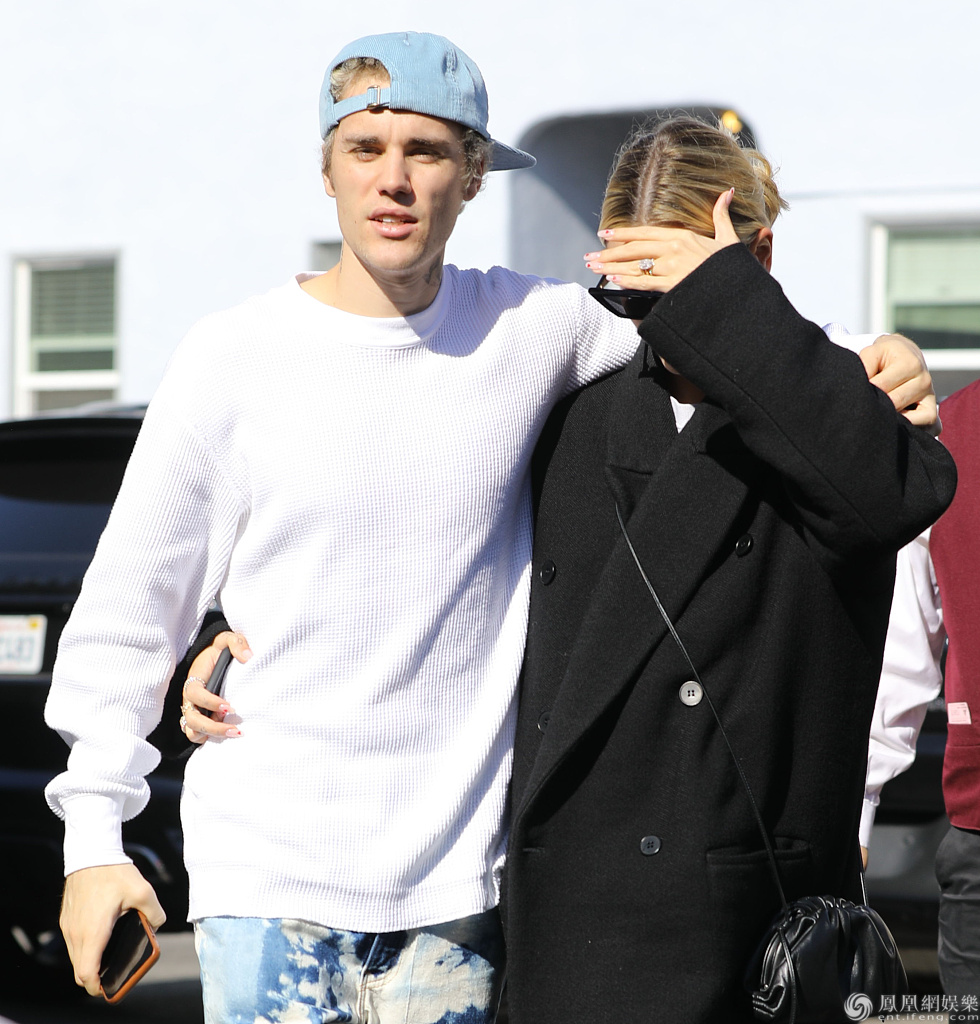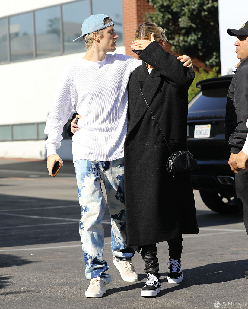 海莉墨镜遮面抬手遮脸,躲避镜头不愿被拍,比伯就霸气搂肩实力护妻。