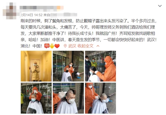据悉,这位“胡歌老婆”是驰援武汉的医护人员,为了防止戴帽子露出头发受到污染,于是刚到武汉不久,就推干净了头发,并在2月14日情人节当天,发微博称“待我长到寸头,我就回广州,齐耳短发就找胡歌相亲”。