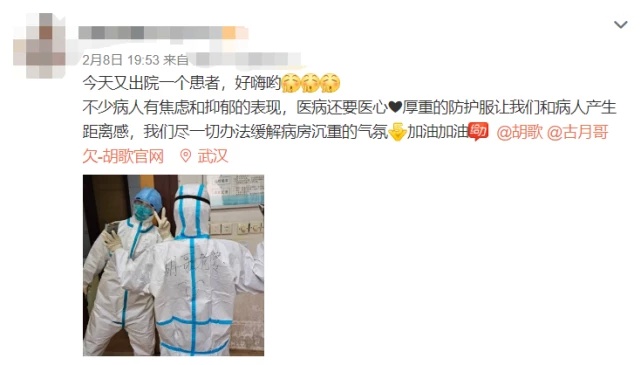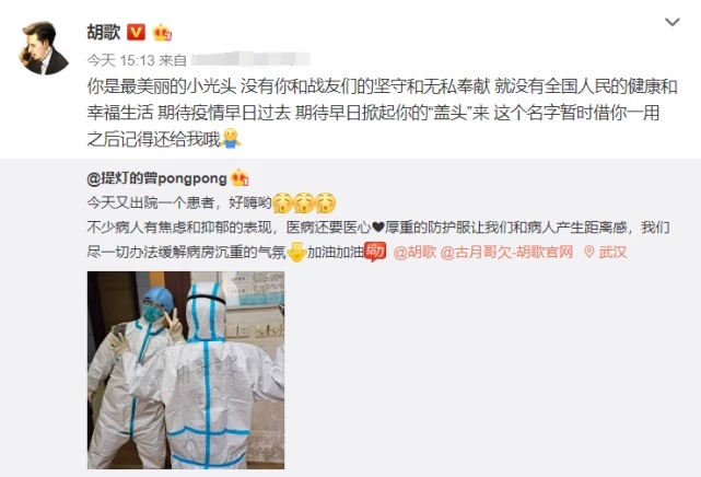 2月16日,胡歌在微博翻牌了一位正在抗疫前线的医护粉丝的微博,这位粉丝在微博中开心地透露今天又有一名患者出院,表示自己作为医护人员,既要医病也要医心,但自己会想尽一切办法去缓解病房中的沉重气氛,最后连发两句加油为自己打气,并配上了一张自己身着写有“胡歌老婆”的防护服的照片且在微博@胡歌。