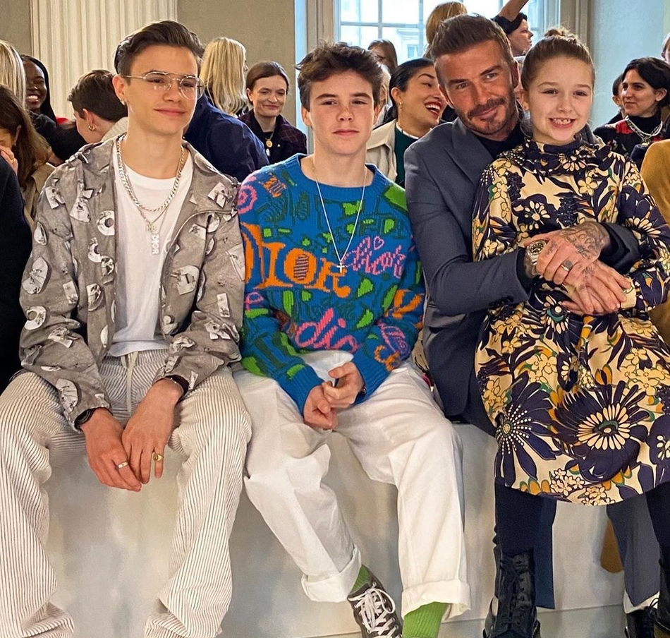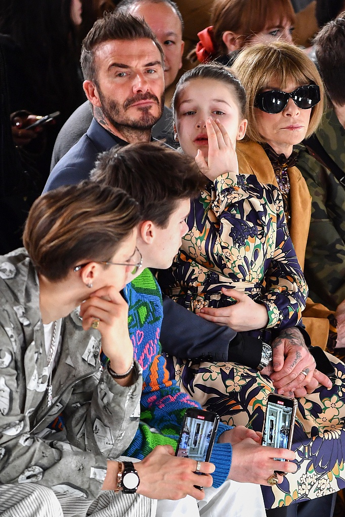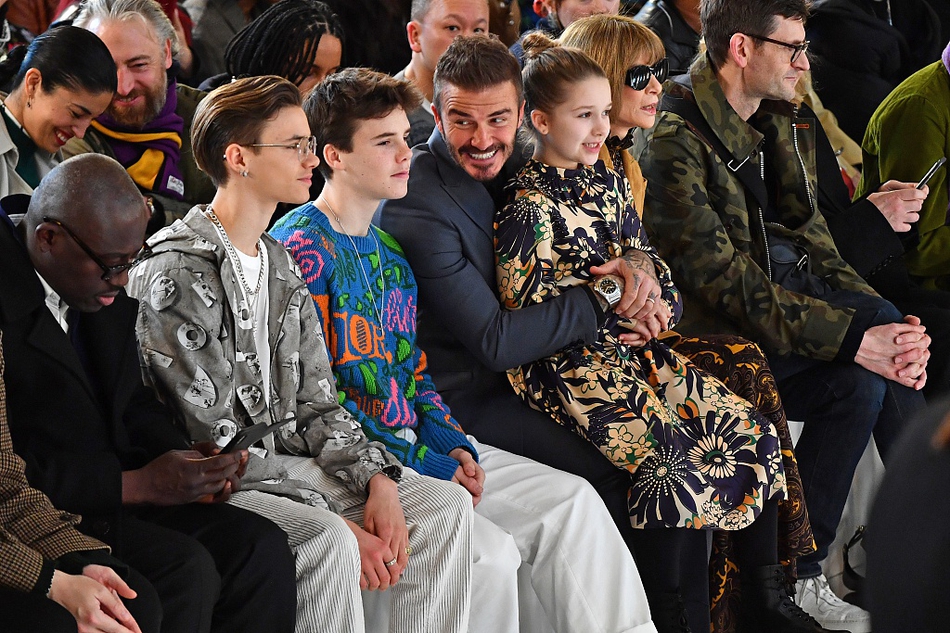 贝克汉姆携孩子亮相伦敦时装周秀场。