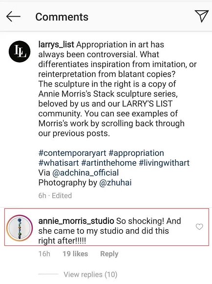 艺术品的原创者还在杂志账号下留言,称“So shocking!And she came to my studio and did this right after!!!”