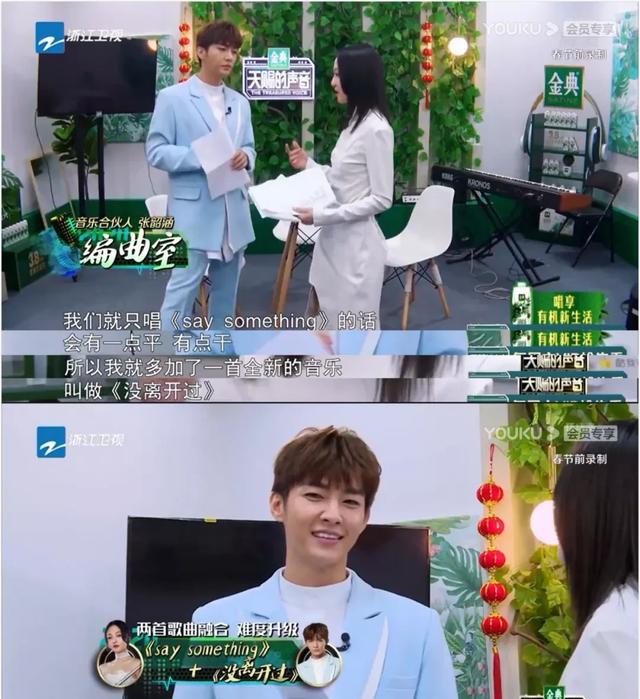 像这期张韶涵的冒险结果,在八八看来就不太OK,她和炎亚纶选的歌是把中文版《say something》和《没离开过》结合起来↓
