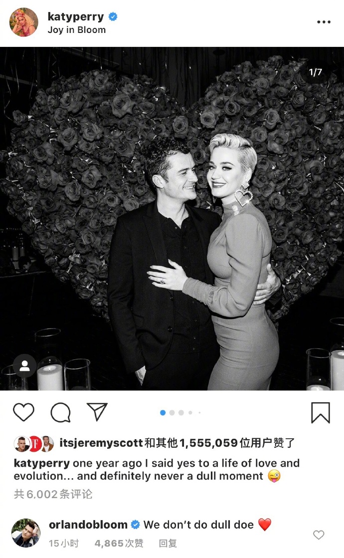 近日,Katy Perry(凯蒂·佩里)在个人社交网站晒庆祝与奥兰多·布鲁姆订婚一周年纪念日,两人在paty上相拥亲吻超