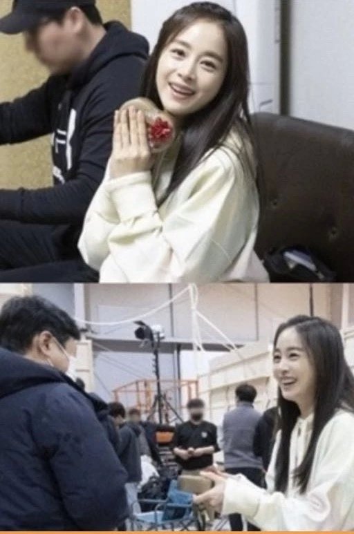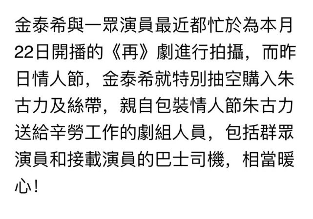 虽然不能与丈夫同度情人节,不过暖心的金泰希依然很重视这个节日,特意购买了一批心形外盒包装的巧克力,亲自用丝带把巧克力包装好,一一亲手送给与她一起辛劳工作的剧组人员,连群众演员和接载演员的大巴司机也有份。