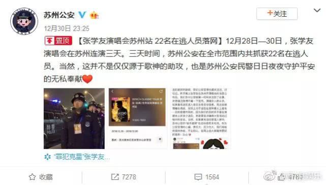 事先做了准备就是不一样,张学友连演3天,苏州警方抓捕了22名逃犯。