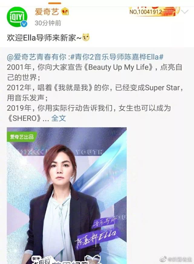 《青春有你》官宣Ella是导师,文案“欢迎来新家”,加狗头也掩盖不住的嘚瑟语气。