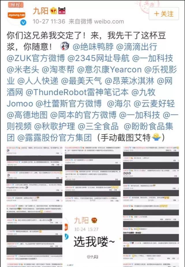 起因是一位网友在挑选豆浆机时,艾特了几家官博,于是不管能不能扯上关系的都来凑热闹了……